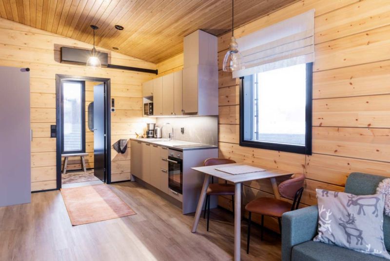 Olohuoneessa on isot ikkunat, joista on näkymä viistottain Tenojoelle ja Norjan tuntureille sekä pohjoisen taivaalle. Terasseilla voit ihastella kesällä keskiyön aurinkoa sekä syksyllä ja talvella revontulia. Vuoden ympäri voit vain nauttia mahtavista maisemista ja hiljaisuudesta.